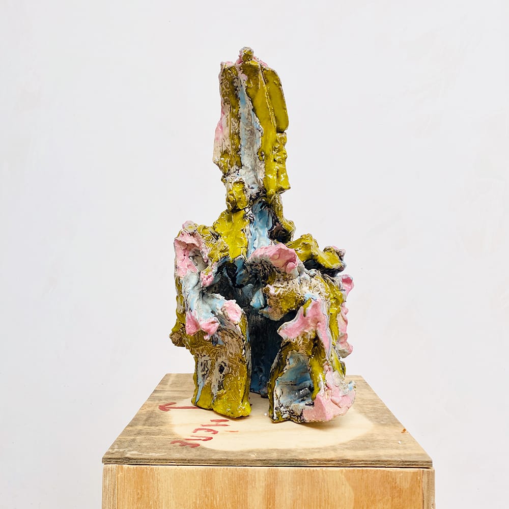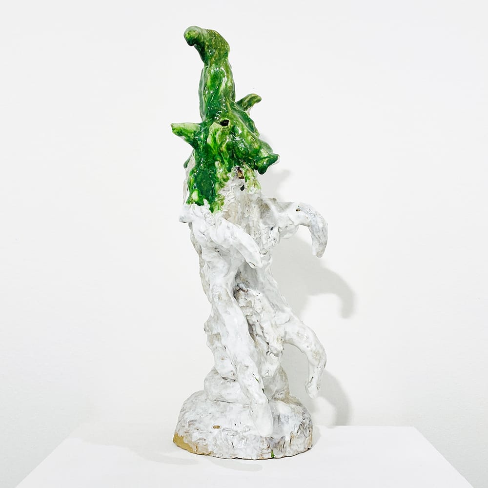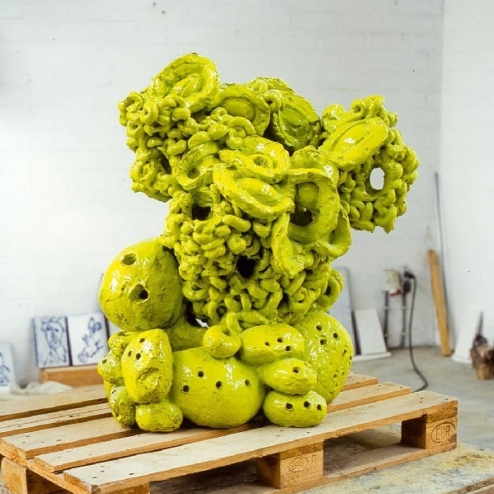 Van Wetering’s sculptures also seem to have fallen from unimaginable heights. They lie naked on their backs, shameless, hilarious, orgiastic. I thought of their baroque predecessors: the exalted virgins pierced with arrows, saints that twisted on their pedestals with divine passion. Van Wetering’s sculptures parody this because they recognize it not as divine mercy but as wounded lecherousness. That’s why they delight in their confusion, their reckless in-jokes as transitional figures between man and animal. They show who they are not, turn themselves inside out so that a bleeding heart becomes a fiery vagina, a phallus shoots rigidly upwards between intestines, a hat grows rank on a head, drains hold the skin open. – Text by Lex ter Braak