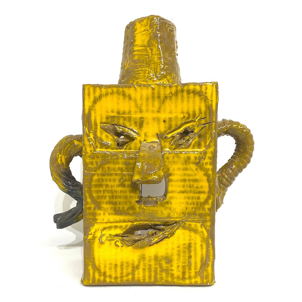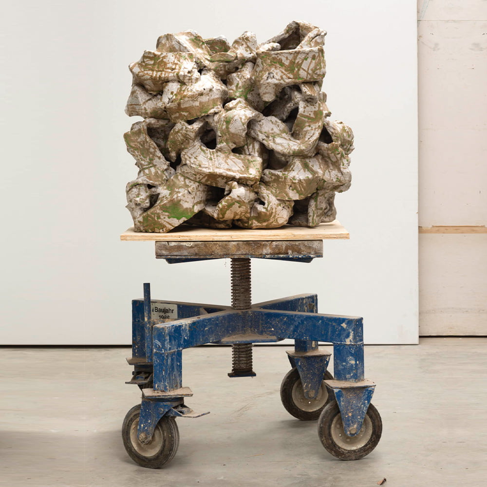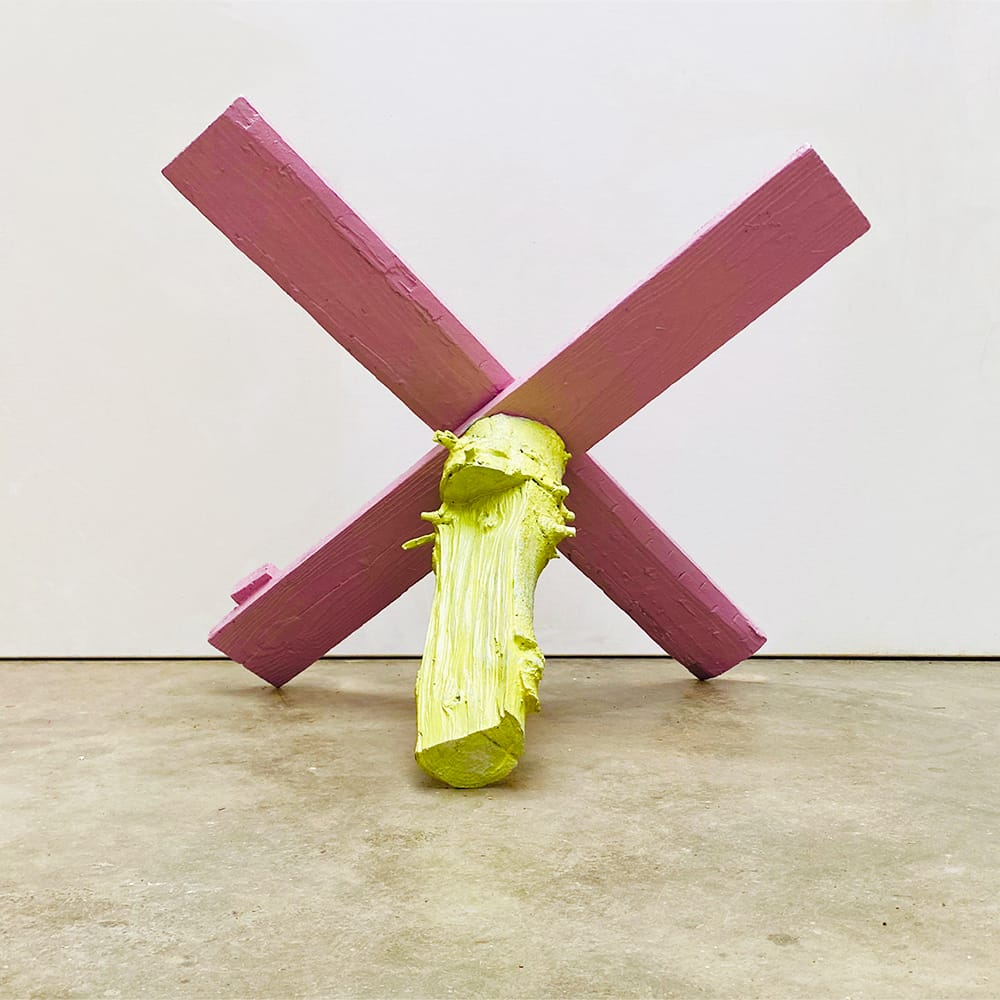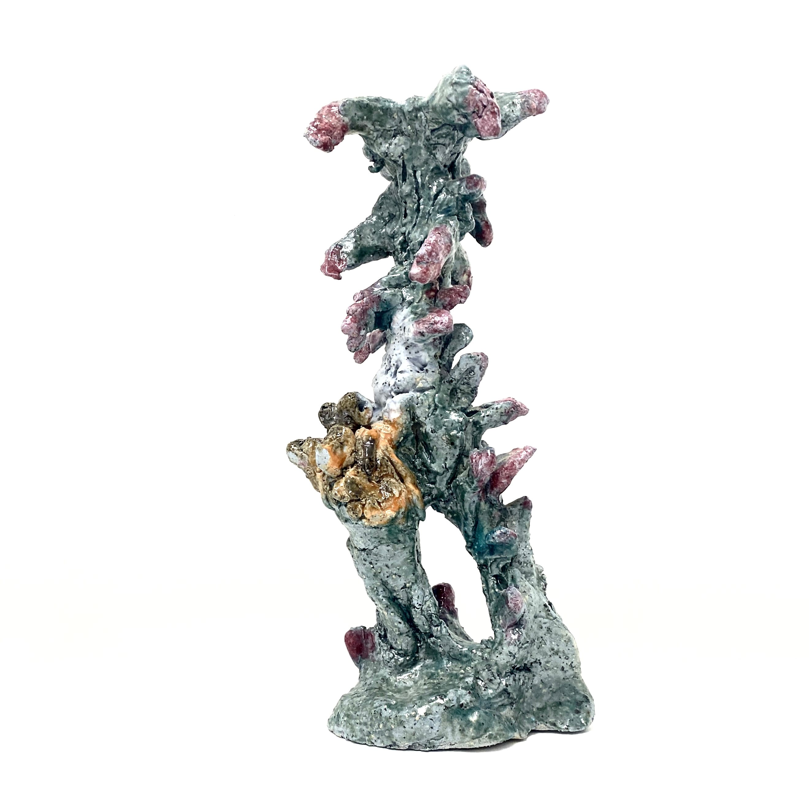 Van Wetering’s sculptures also seem to have fallen from unimaginable heights. They lie naked on their backs, shameless, hilarious, orgiastic. I thought of their baroque predecessors: the exalted virgins pierced with arrows, saints that twisted on their pedestals with divine passion. Van Wetering’s sculptures parody this because they recognize it not as divine mercy but as wounded lecherousness. That’s why they delight in their confusion, their reckless in-jokes as transitional figures between man and animal. They show who they are not, turn themselves inside out so that a bleeding heart becomes a fiery vagina, a phallus shoots rigidly upwards between intestines, a hat grows rank on a head, drains hold the skin open. – Text by Lex ter Braak