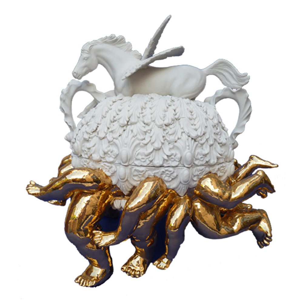 Using molds made from everyday unnecessary junk, Giezen makes us aware of our idiotic behaviour. The enormous footprints we make or our addiction to our phones for example. Working in porcelain which is strong, radiates power and makes colors shine, makes difficult subjects light and cheerful. She would rather that we approach her objects light-heartedly, and discover that they are comic, tragic and touching all in one. You can laugh out loud about your own shortcomings. These are ceramics to love, if you dare.