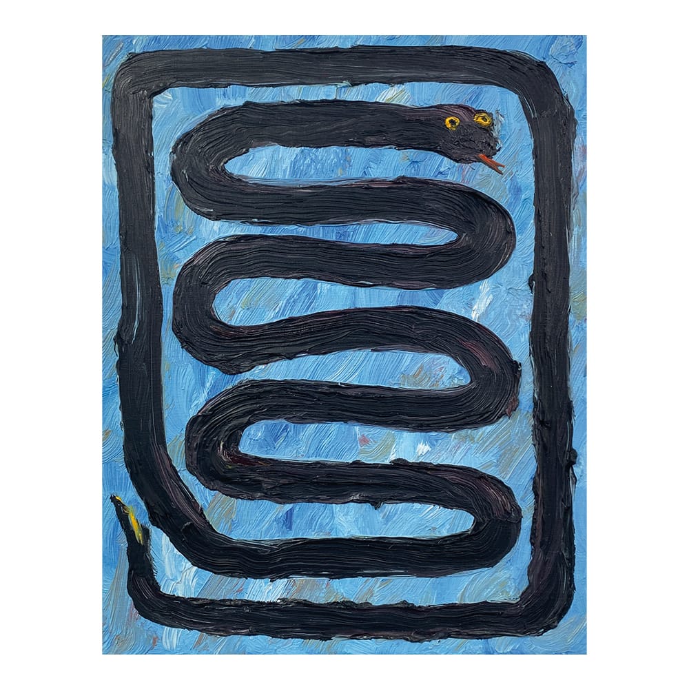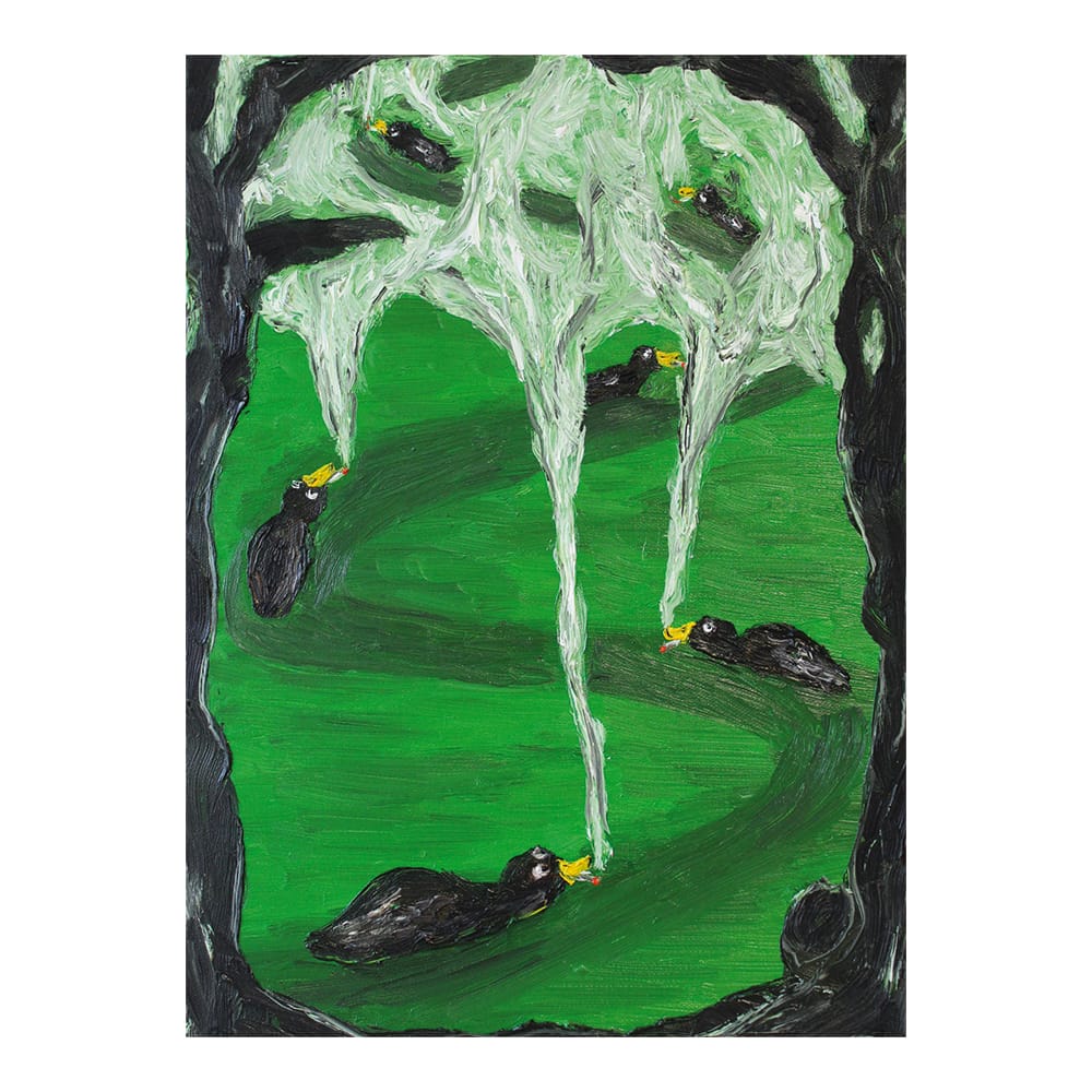 What Jeroen Duijf experiences outside the studio, he converts into images in the studio. He paints at the table, so that the thickly applied paint does not run from the canvas, to then give the works that are finished and dry a place on his full studio walls. There, his characteristic cartoony imagery returns, brought together in ever different combinations. “It’s actually one big comic book, “ says Duijf. In Jeroen’s universe a toy dinosaur radiates childlike innocence and fun, and a palm tree shows us paradise. Also, a skull appears as an ominous memento mori, who points out tonus with a broad grin the transience of life. Party hat on, cigarette in the corner of the mouth, laughter is allowed, but the outcome is certain. How direct the accurate painted characters on canvas appear at first sight, their meanings are not black ands white. Does the dinosaur have a clear conscience or does he, looking up at the dangerous T-rex with questioning puppy eyes, unexpectedly end up on the wrong path? Isn’t paradise ultimately more a redeemable place or even a prison, when the palm tree repeats itself in the pattern of wallpaper or allows itself to be captured like a wasp under a glass? And even though the skull pretends to be invincible, sometimes it is overgrown by nature or used disrespectfully as a candlestick, with the candle wax dripping down his helpless forehead. The roles can be reversed at any time. – Text by Merel van den Nieuwenhof.
